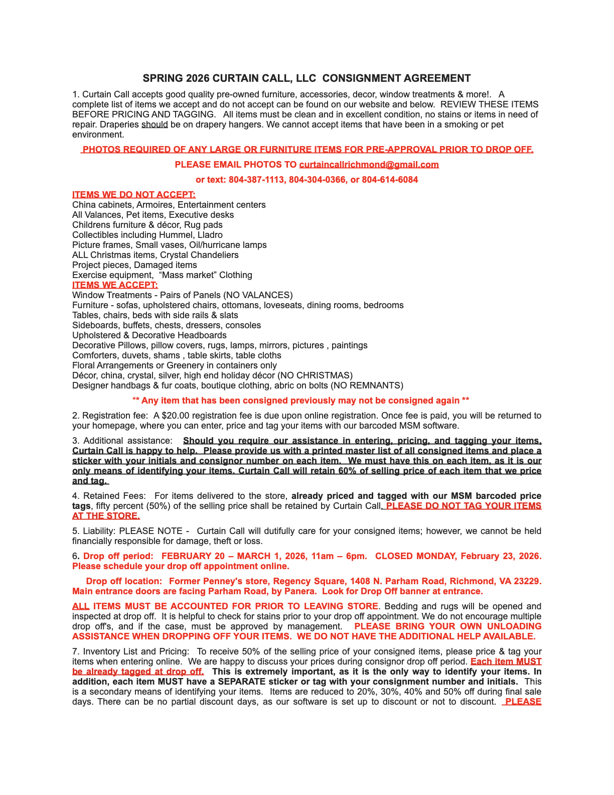 This consignor agreement is on My Sales Manager (MSM), the online system used by consignors to enter items and track sales. You will be able to complete the agreement during the online process in MSM. When reading the agreement online, there will be a space to enter "YES" to agree to the terms. The form is shown below for consignors to read and review. You cannot complete the form on this page; it is "read only" here. There is no need to print it out because you will be completing it online when entering your items.